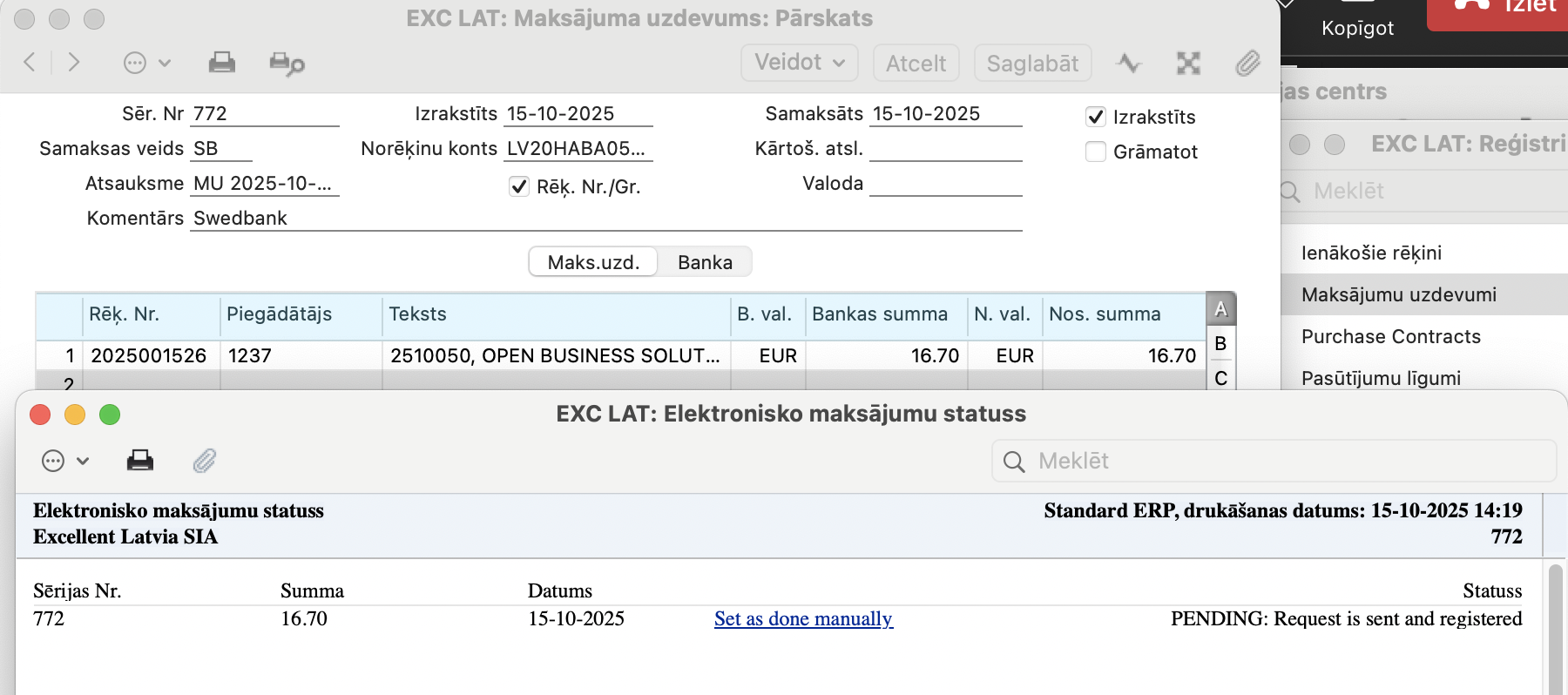 Ja šīs maksājuma rindas bankā faktiski ir apmaksātas, varat manuāli atzīmēt maksājumu kā veiktu. Lai to izdarītu, atveriet maksājuma uzdevumu un operāciju izvēlnē atlasiet “E-maksājuma uzdevuma statuss”, atvērtajā pārskatā noklikšķiniet uz saites “Set as done manually”. Pēc tam arī šis maksājums būs redzams zaļā krāsā.