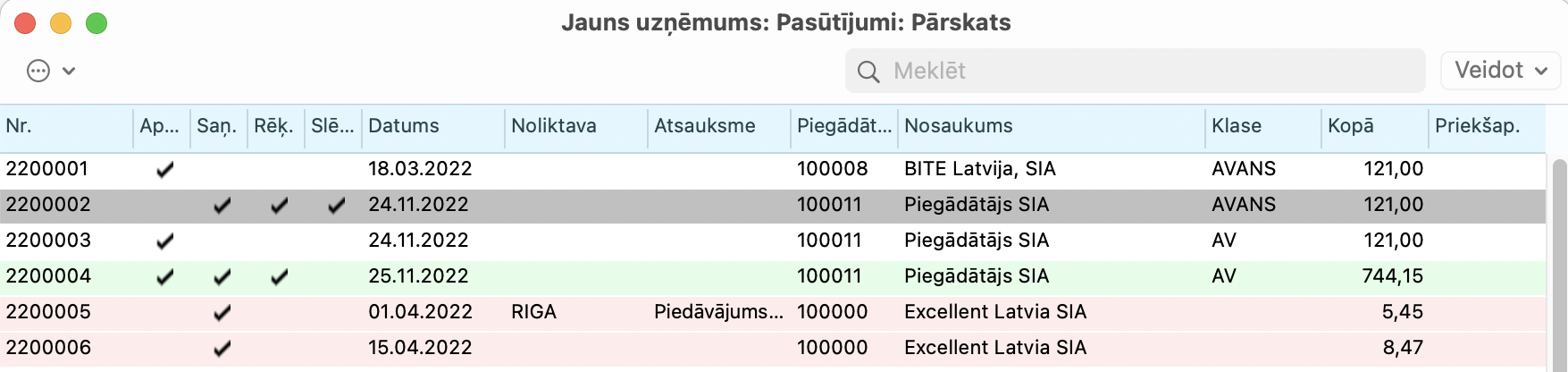 Atverot Loģistika > Reģistri > Pasūtījumi rindas tiek automātiski atzīmētas ar dažādām krāsām.