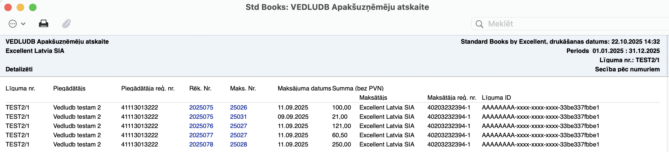 Šī atskaite dot iespēju ērti pārlūkot visus apakšuzņēmēju maksājumu uzdevumus noteiktā laika periodā, ļaujot tos izfiltrēt pēc Līguma numura vai rēķinā norādītā Objekta.